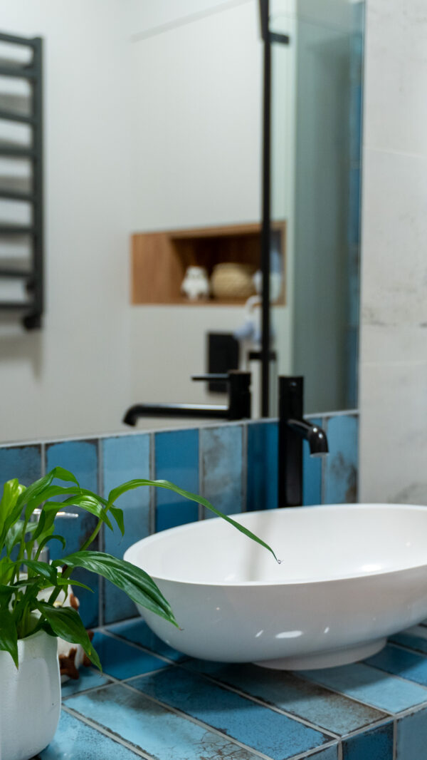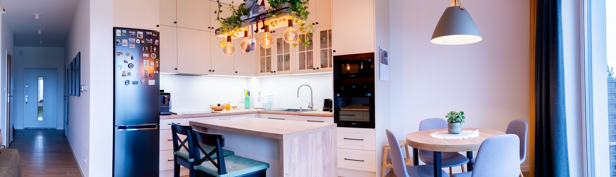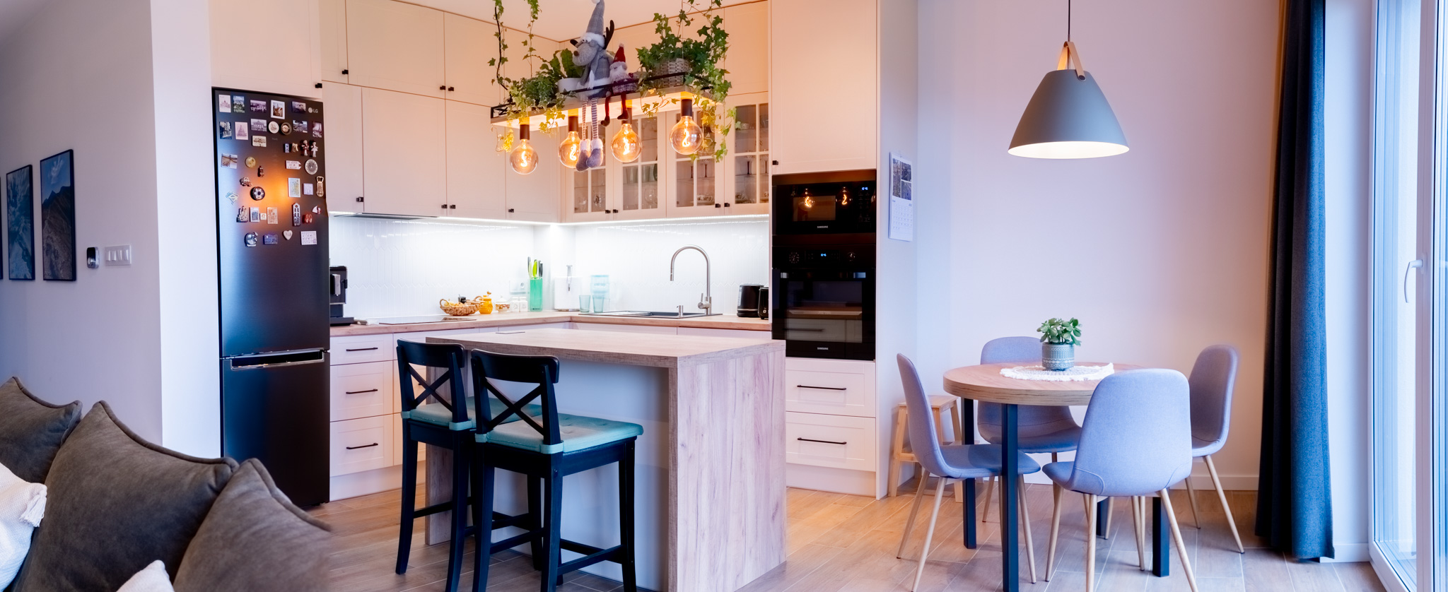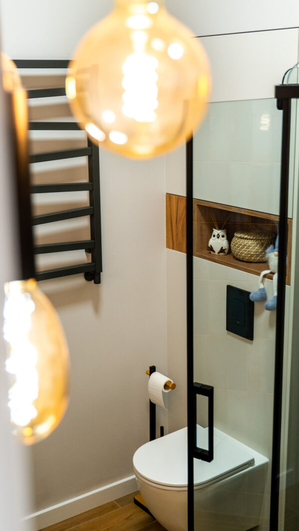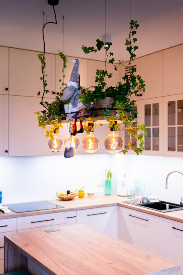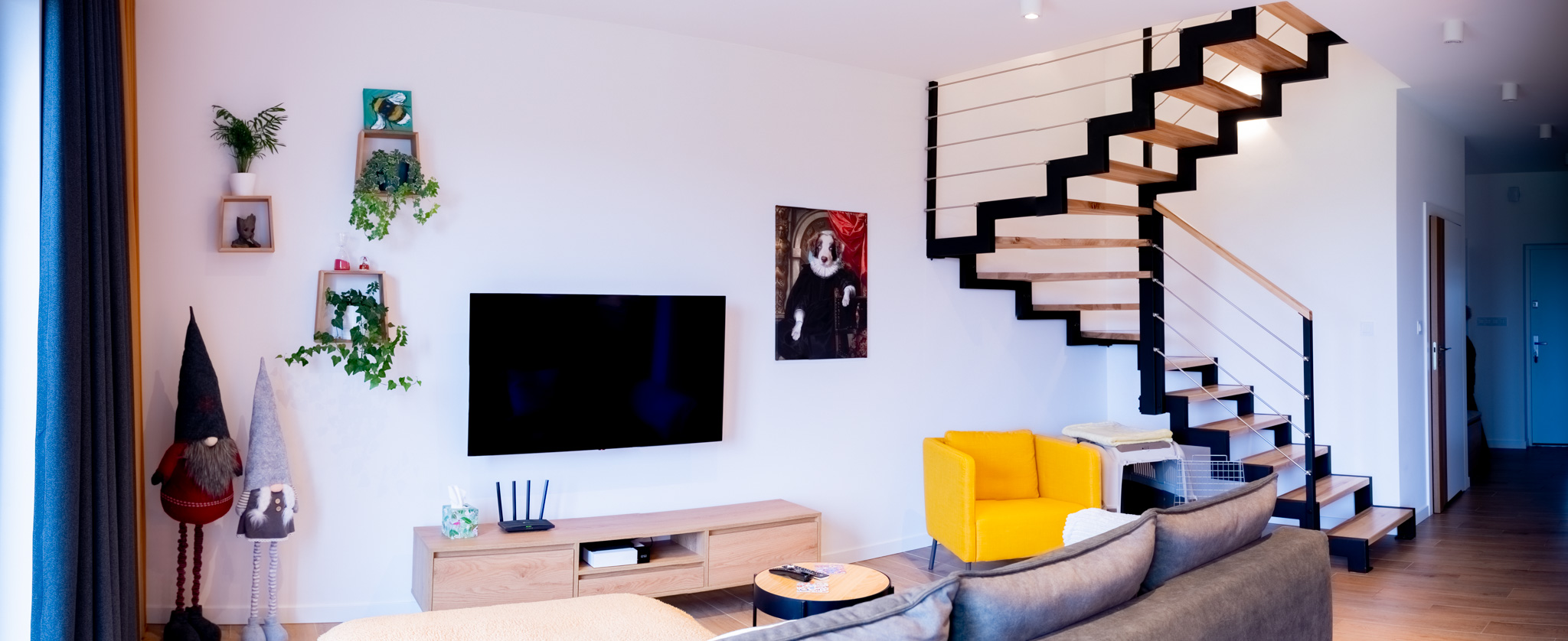 Ściany zdobią stylowe półki z roślinami i nowoczesne dekoracje, które dodają charakteru i osobistego stylu. Miękka sofa oraz wygodne fotele zachęcają do odpoczynku, a dobrze dobrane dodatki, takie jak zasłony i dywany, dopełniają całości, tworząc przestrzeń, która jest zarówno funkcjonalna, jak i estetyczna. Zapraszam do odkrycia więcej ujęć z tego wyjątkowego domu w Krzyżowicach, który łączy w sobie nowoczesny design i ciepło domowego ogniska.