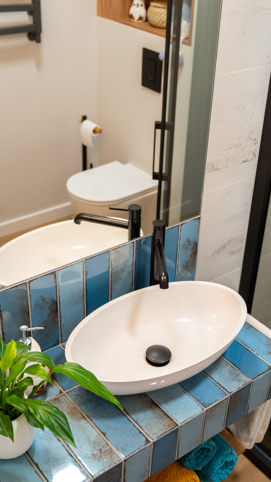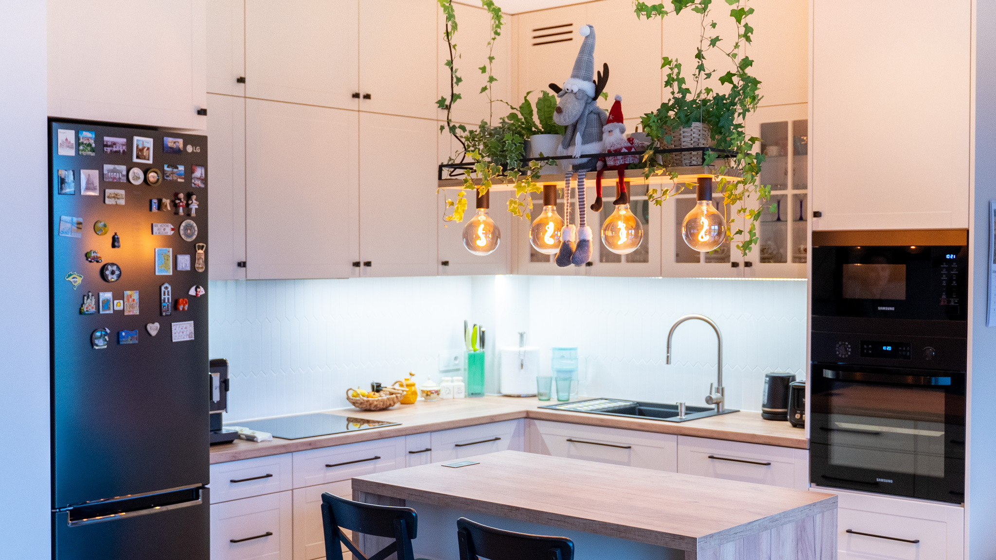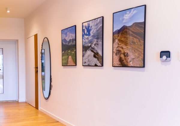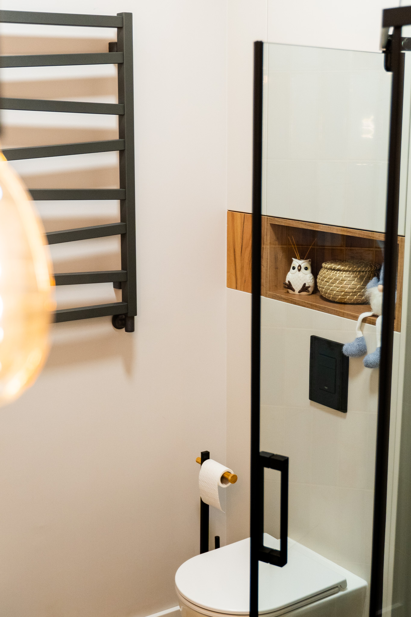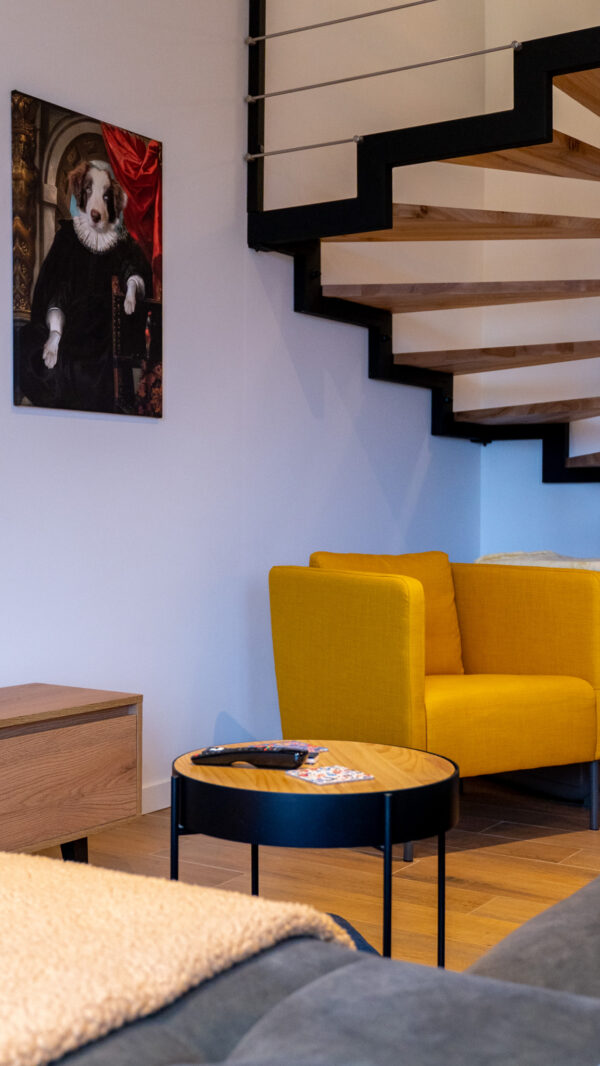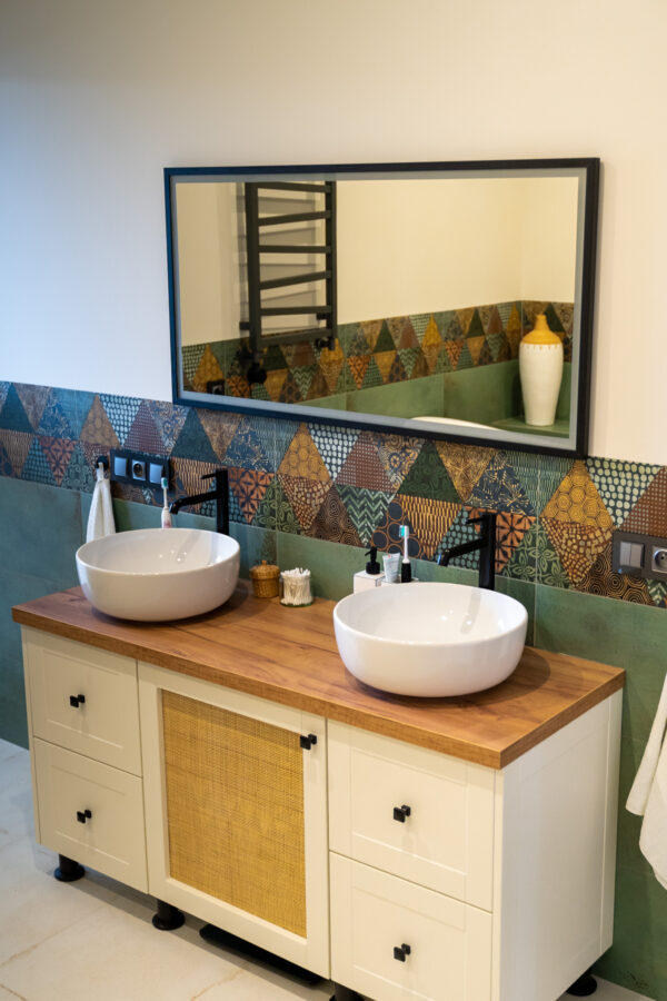 Ściany zdobią stylowe półki z roślinami i nowoczesne dekoracje, które dodają charakteru i osobistego stylu. Miękka sofa oraz wygodne fotele zachęcają do odpoczynku, a dobrze dobrane dodatki, takie jak zasłony i dywany, dopełniają całości, tworząc przestrzeń, która jest zarówno funkcjonalna, jak i estetyczna. Zapraszam do odkrycia więcej ujęć z tego wyjątkowego domu w Krzyżowicach, który łączy w sobie nowoczesny design i ciepło domowego ogniska.