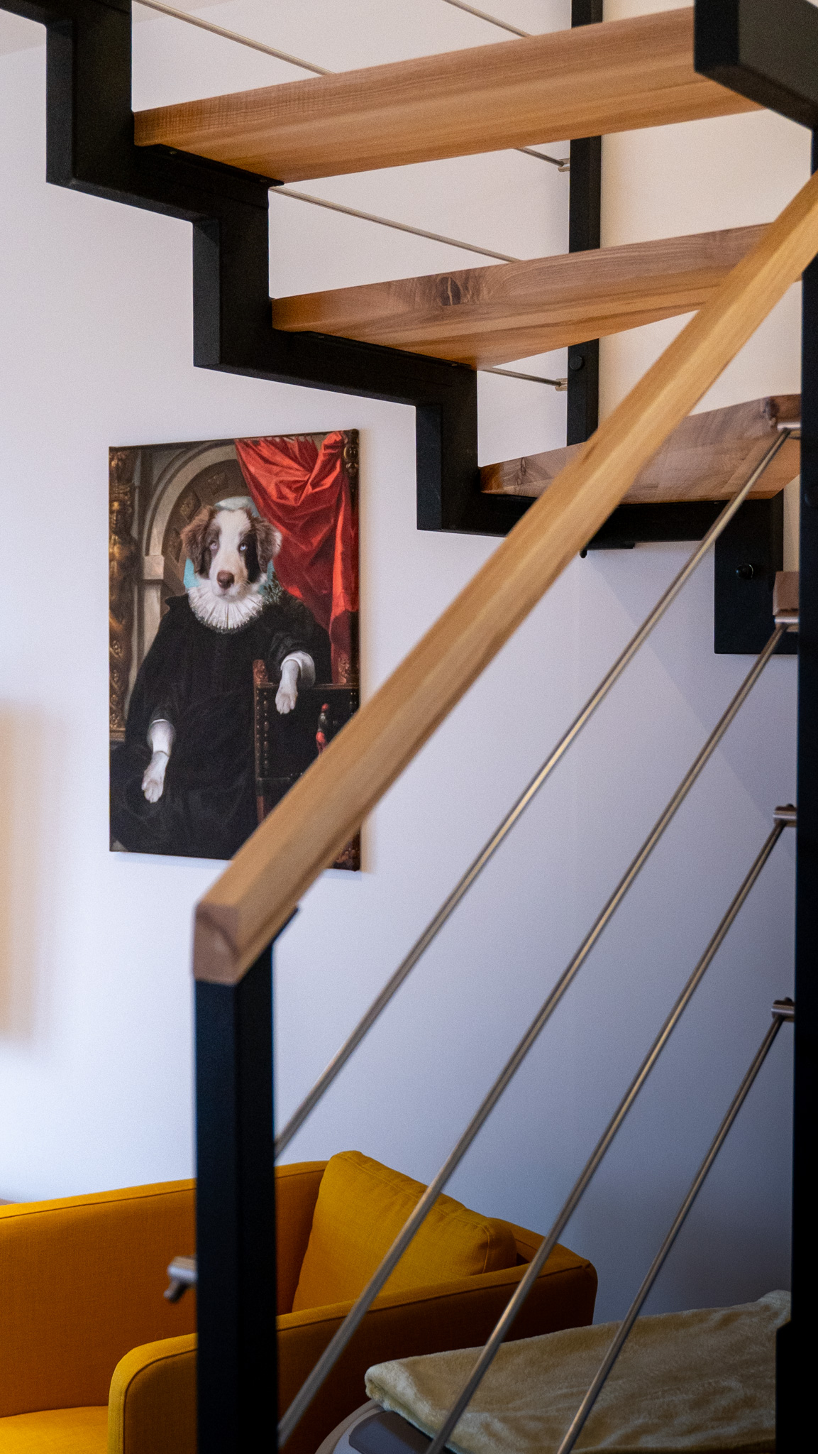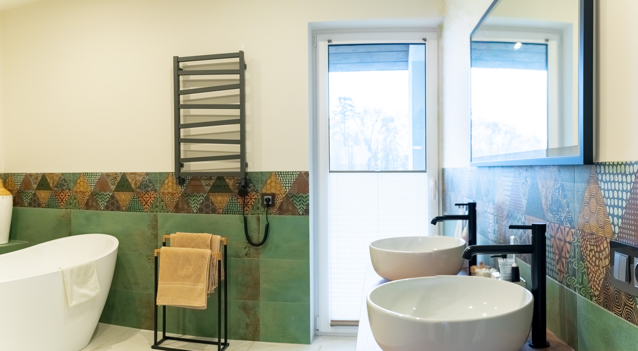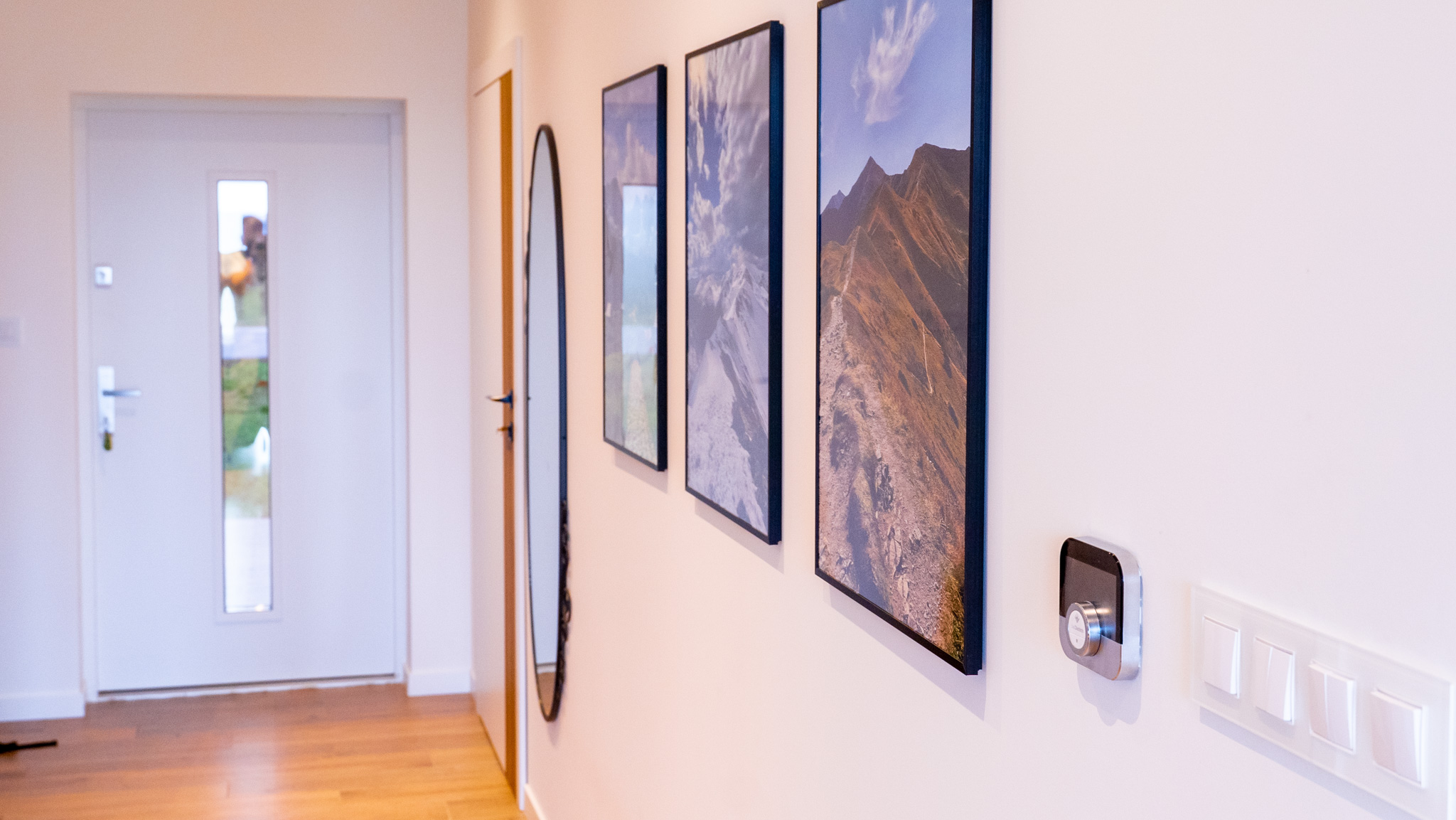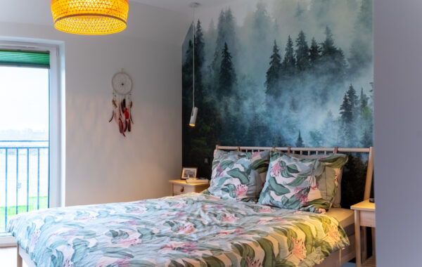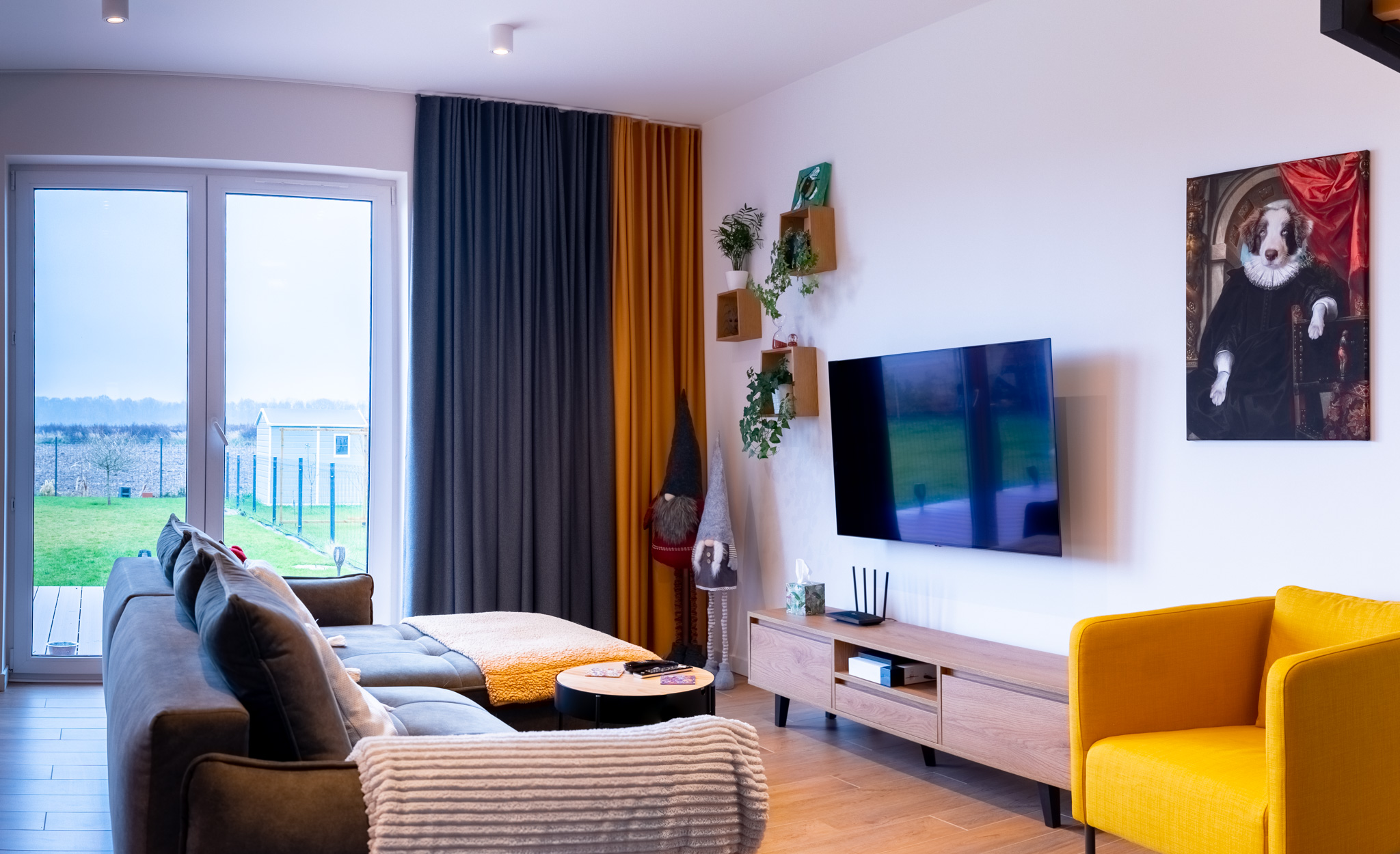 Ten przytulny dom w Krzyżowicach to doskonały przykład harmonii pomiędzy nowoczesnością a domowym komfortem. Zdjęcia przedstawiają między innymi jasny, otwarty salon, w którym króluje ciepła paleta barw, łącząca odcienie szarości i żółci, co tworzy przytulną atmosferę sprzyjającą relaksowi. Duże okna balkonowe wpuszczają do wnętrza mnóstwo naturalnego światła, jednocześnie oferując widok na zielony ogród, który staje się integralną częścią tej przestrzeni.