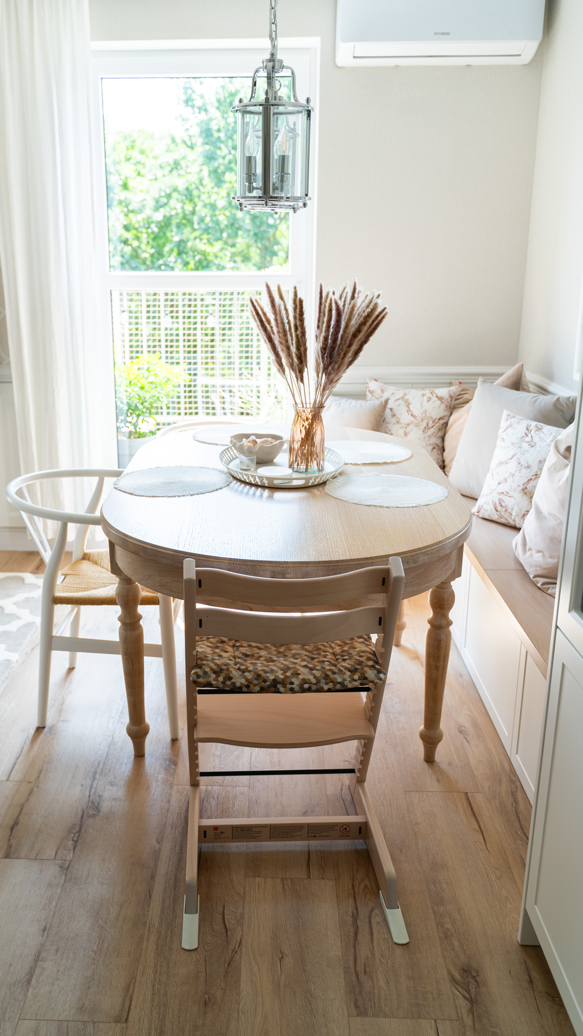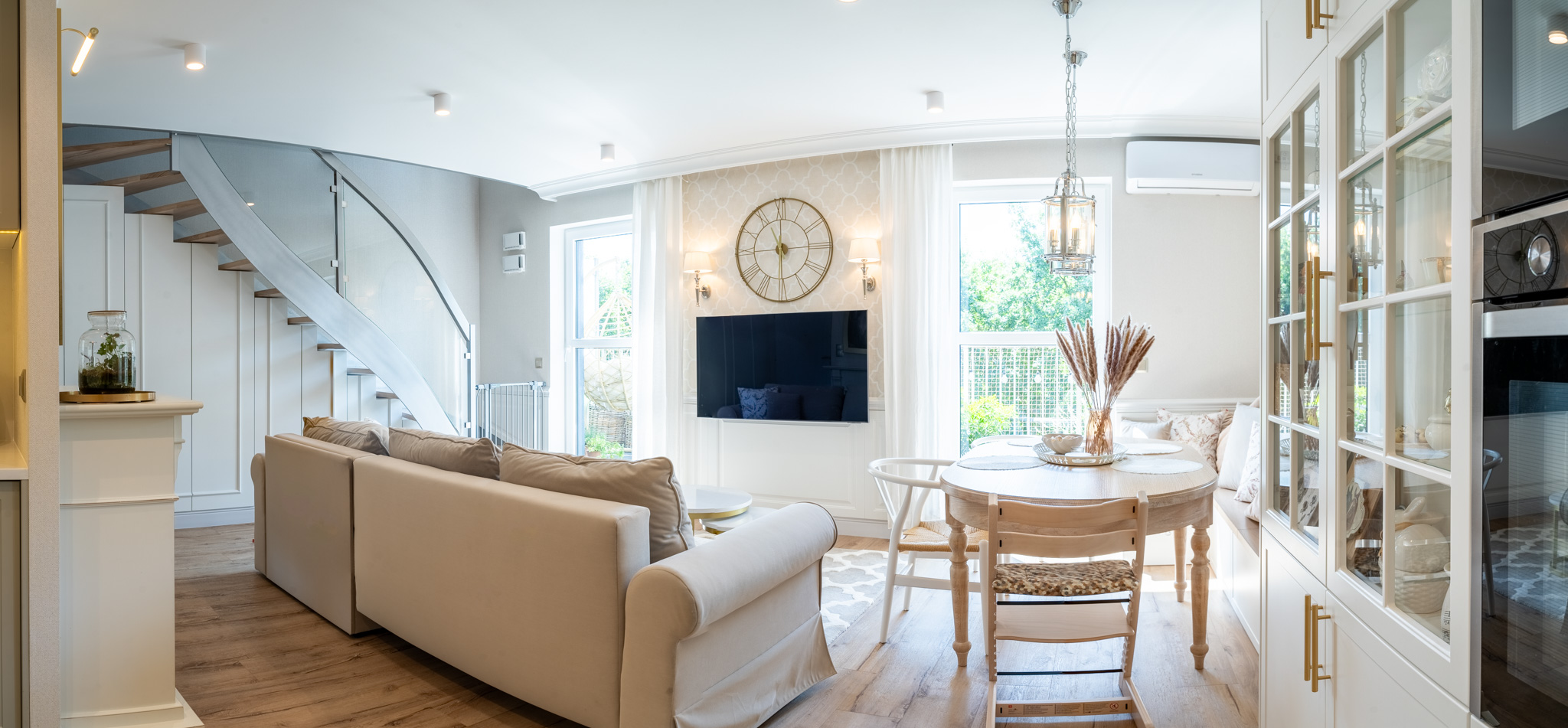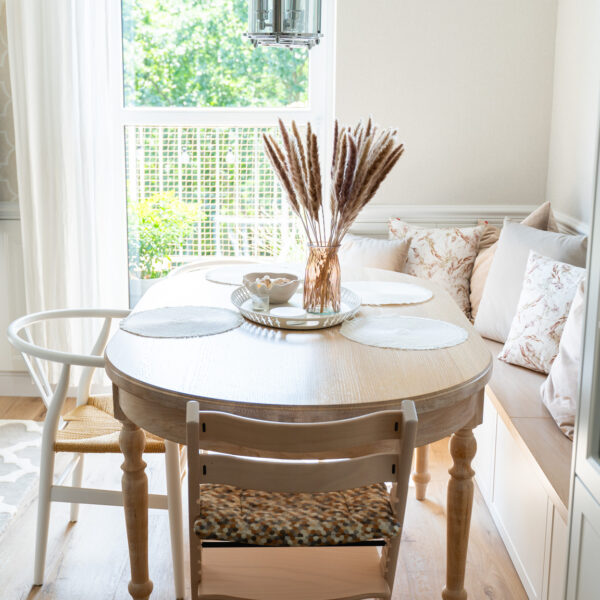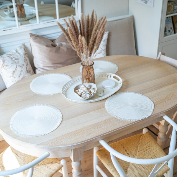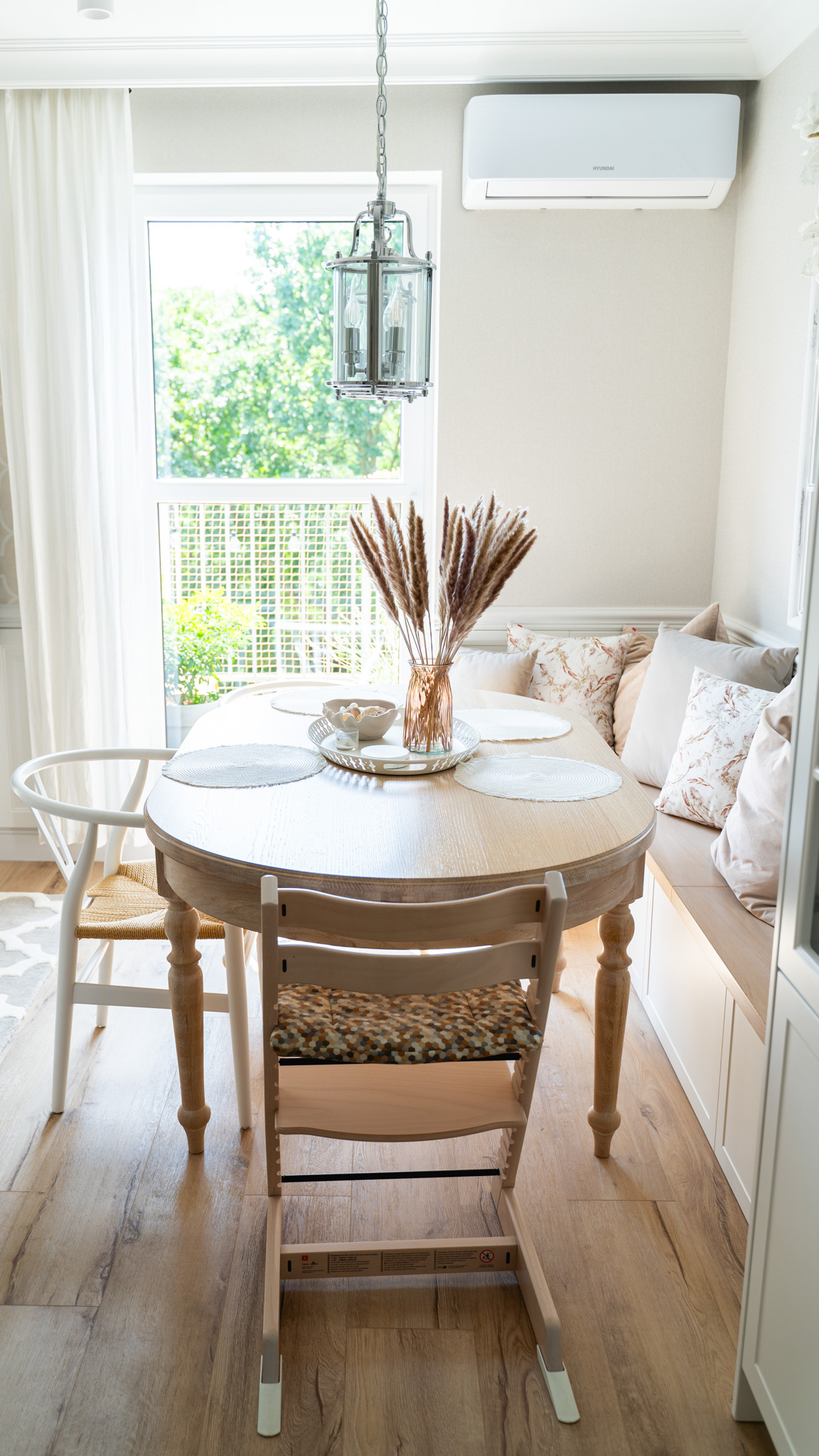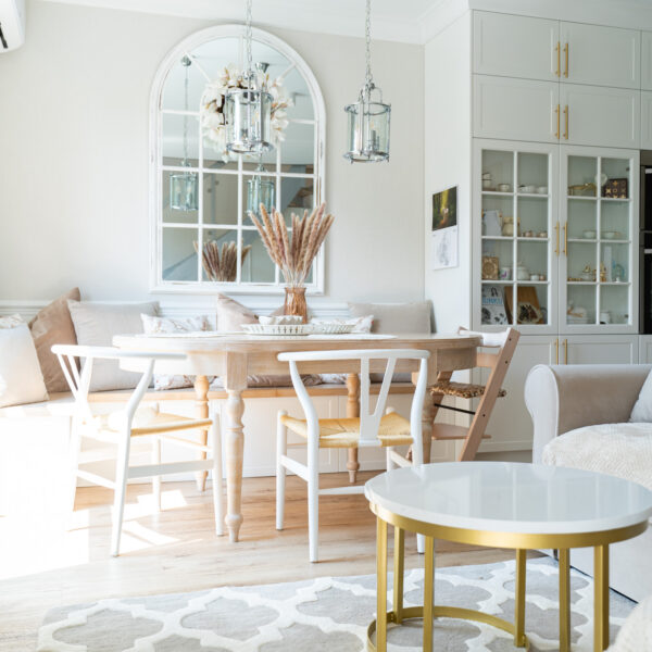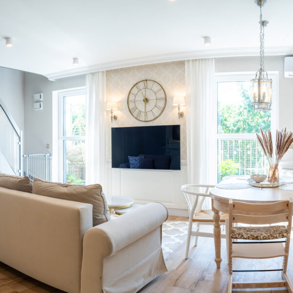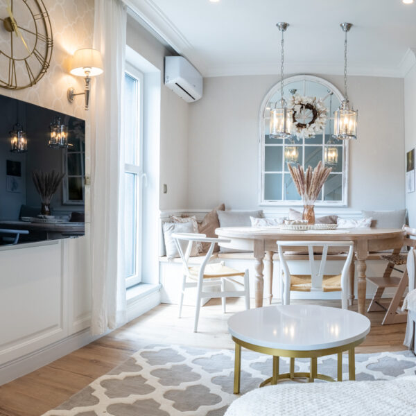 To mieszkanie na zlokalizowane na wrocławskich Wojszycach łączy elegancję i funkcjonalność, tworząc przestrzeń idealną dla osób ceniących komfort i styl. Na głównym zdjęciu widać pięknie zaprojektowany salon z otwartą kuchnią, który zachwyca jasną kolorystyką oraz przemyślanym doborem mebli i dodatków. Strefa jadalniana wyróżnia się okrągłym stołem otoczonym wygodnymi krzesłami oraz wbudowaną ławką, co nadaje wnętrzu przytulny charakter i zachęca do spędzania czasu w gronie najbliższych.