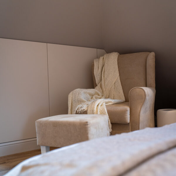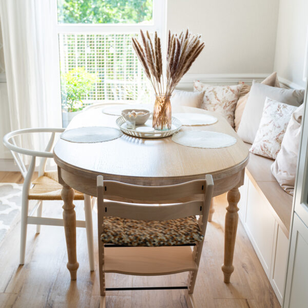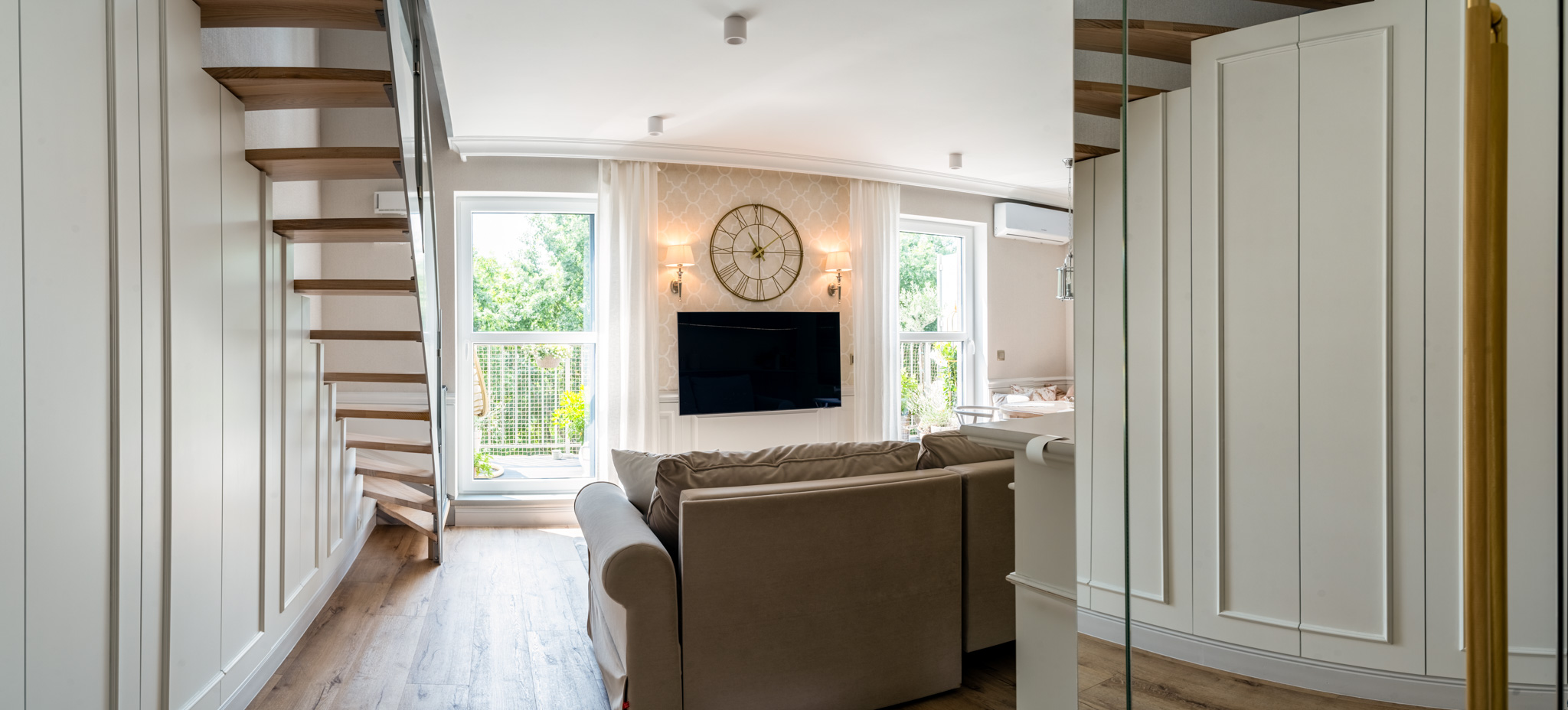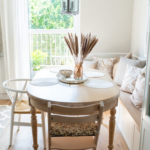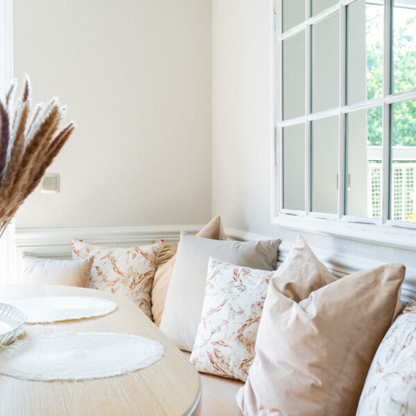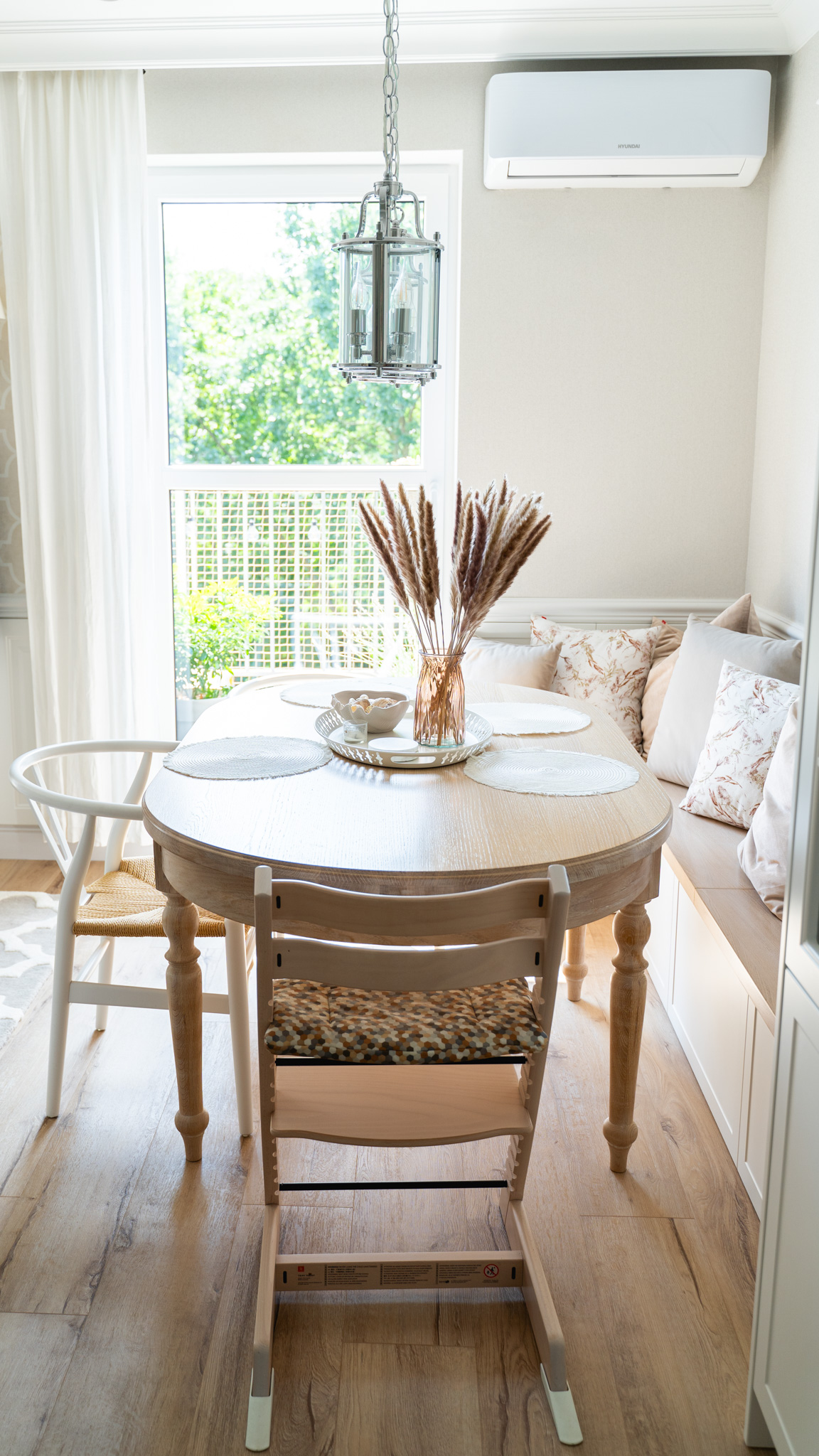 To mieszkanie na zlokalizowane na wrocławskich Wojszycach łączy elegancję i funkcjonalność, tworząc przestrzeń idealną dla osób ceniących komfort i styl. Na głównym zdjęciu widać pięknie zaprojektowany salon z otwartą kuchnią, który zachwyca jasną kolorystyką oraz przemyślanym doborem mebli i dodatków. Strefa jadalniana wyróżnia się okrągłym stołem otoczonym wygodnymi krzesłami oraz wbudowaną ławką, co nadaje wnętrzu przytulny charakter i zachęca do spędzania czasu w gronie najbliższych.
