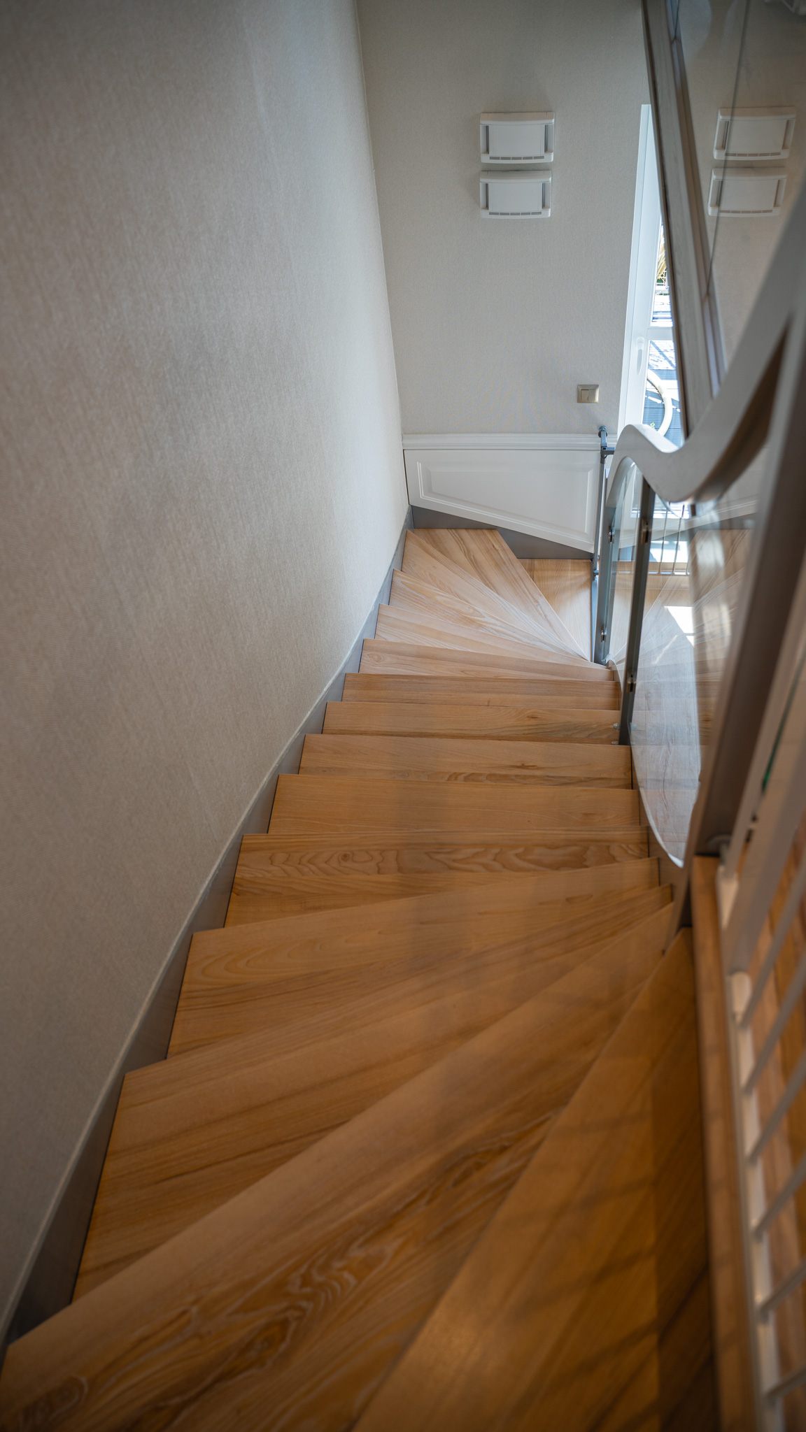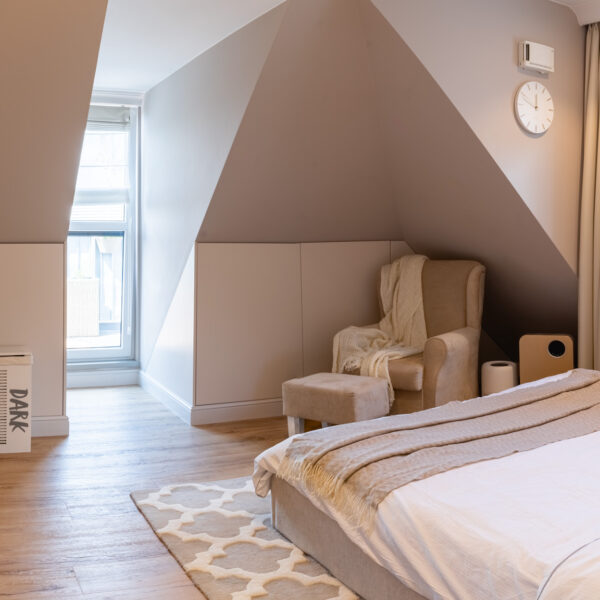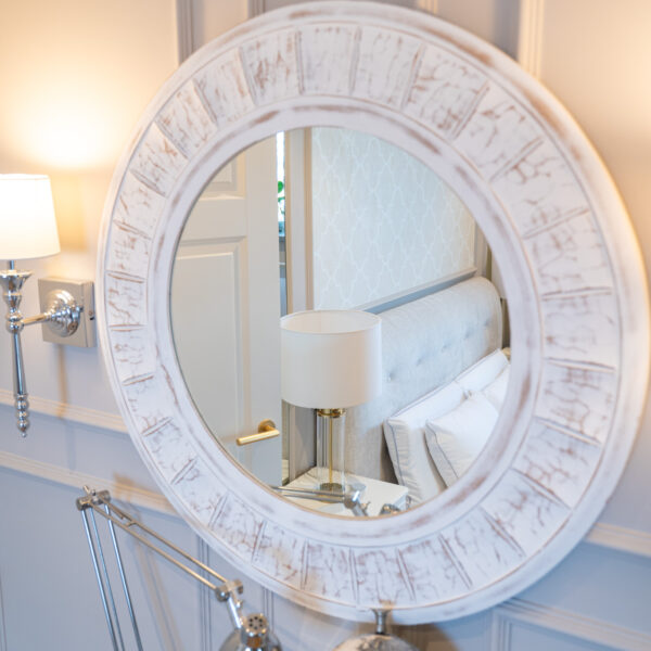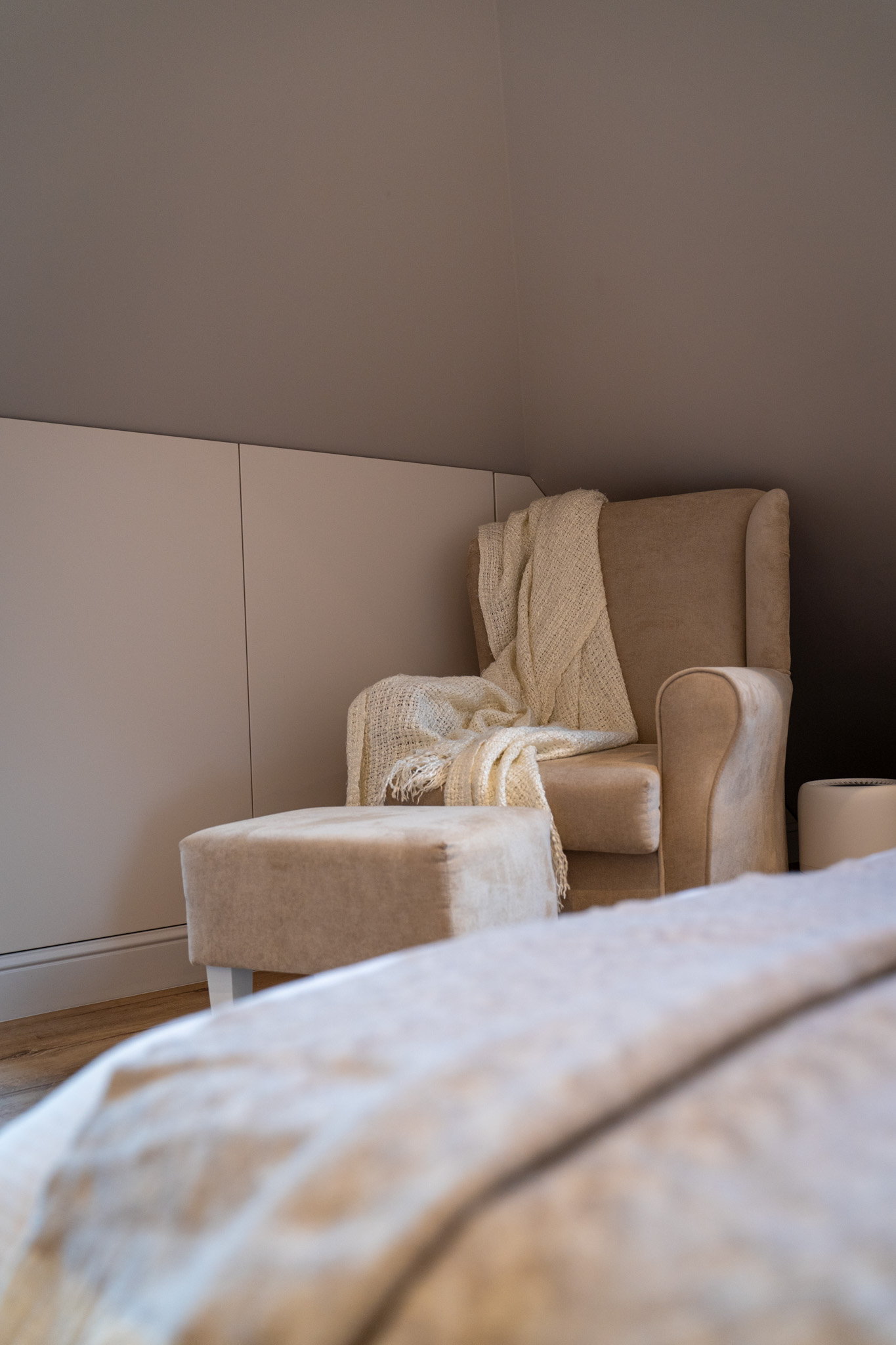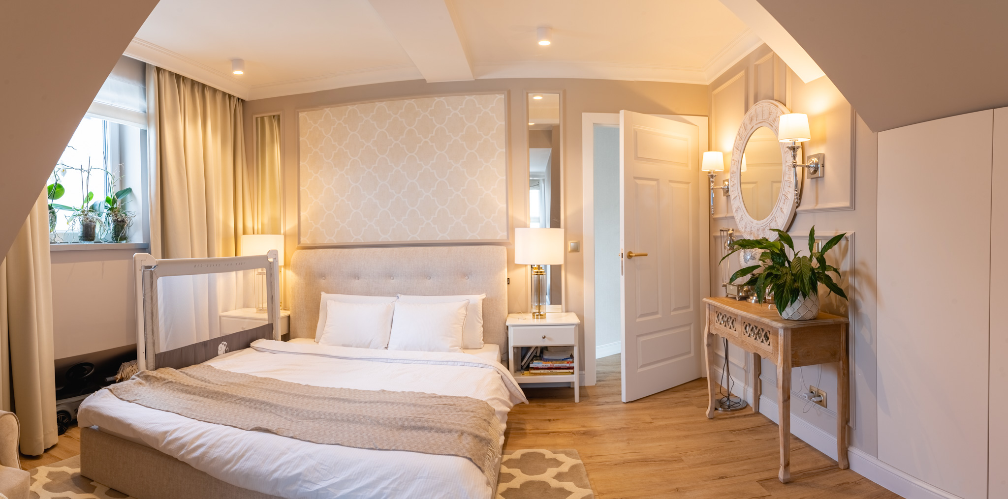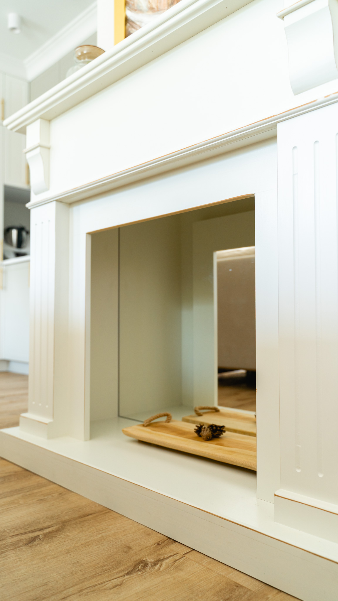 To mieszkanie na zlokalizowane na wrocławskich Wojszycach łączy elegancję i funkcjonalność, tworząc przestrzeń idealną dla osób ceniących komfort i styl. Na głównym zdjęciu widać pięknie zaprojektowany salon z otwartą kuchnią, który zachwyca jasną kolorystyką oraz przemyślanym doborem mebli i dodatków. Strefa jadalniana wyróżnia się okrągłym stołem otoczonym wygodnymi krzesłami oraz wbudowaną ławką, co nadaje wnętrzu przytulny charakter i zachęca do spędzania czasu w gronie najbliższych.