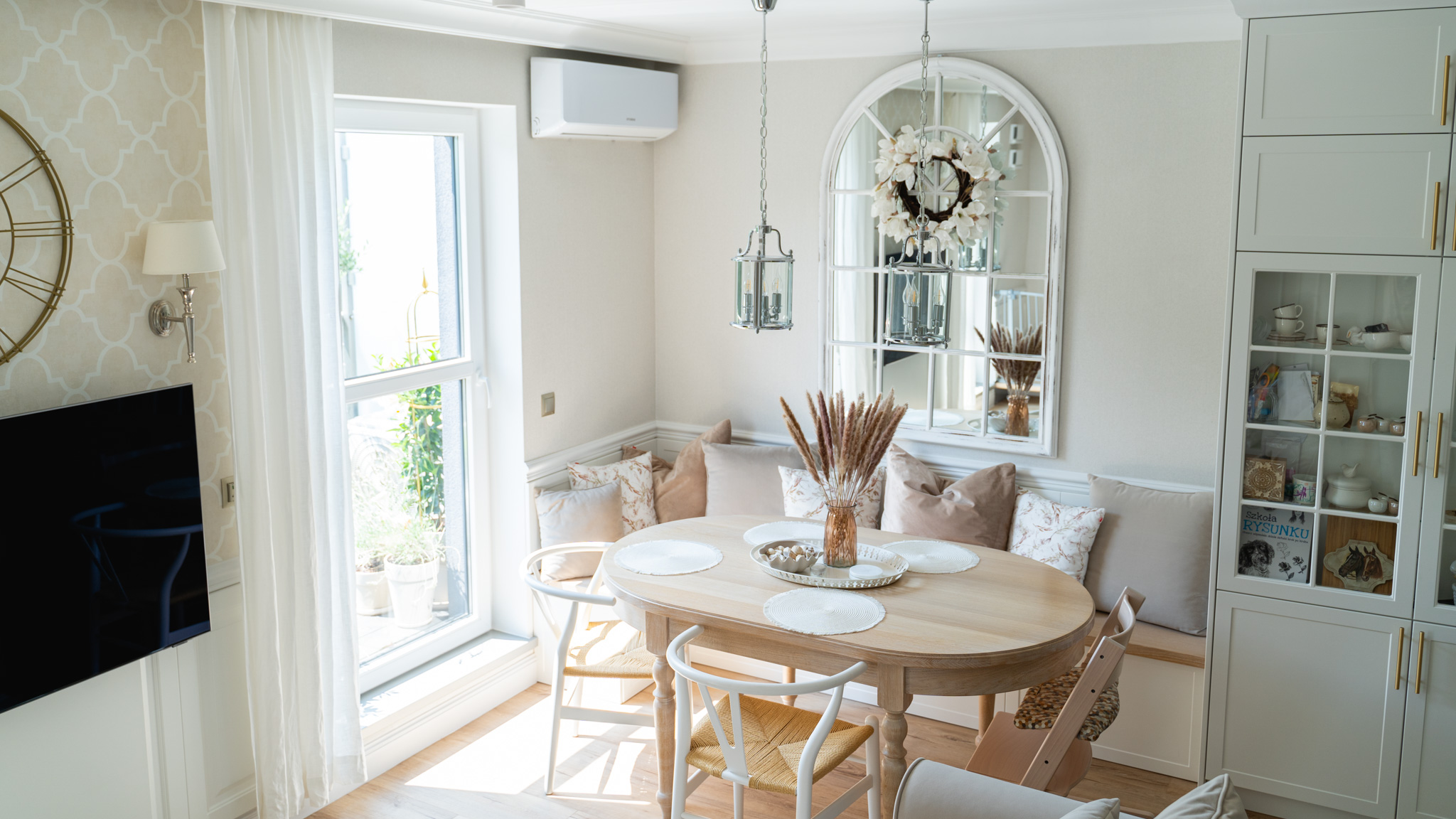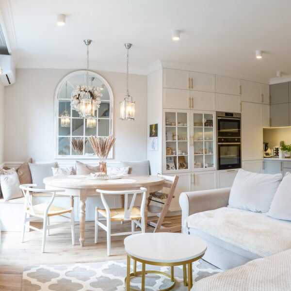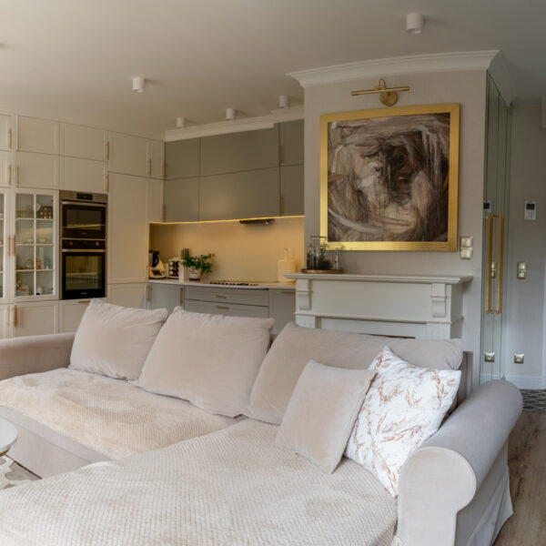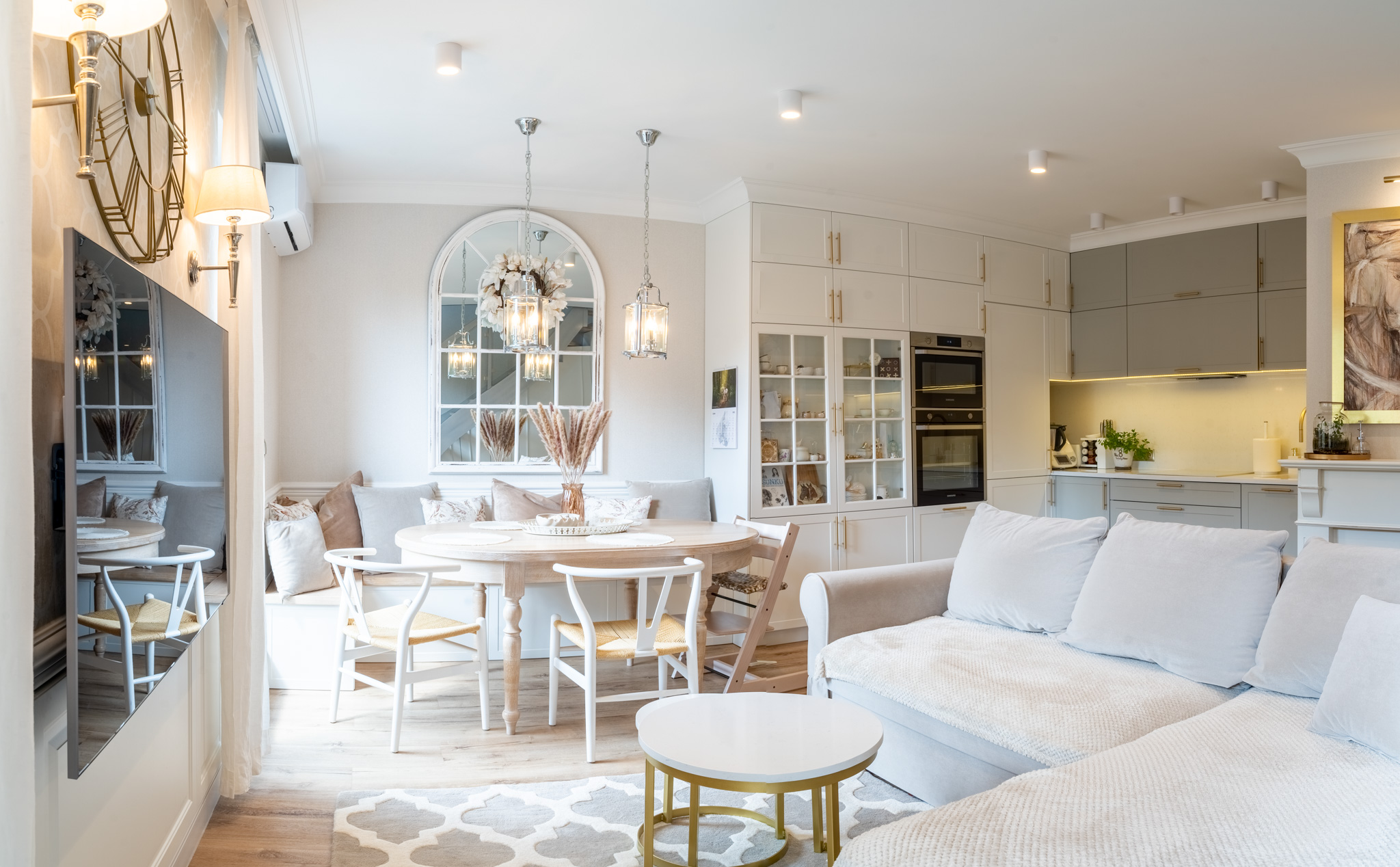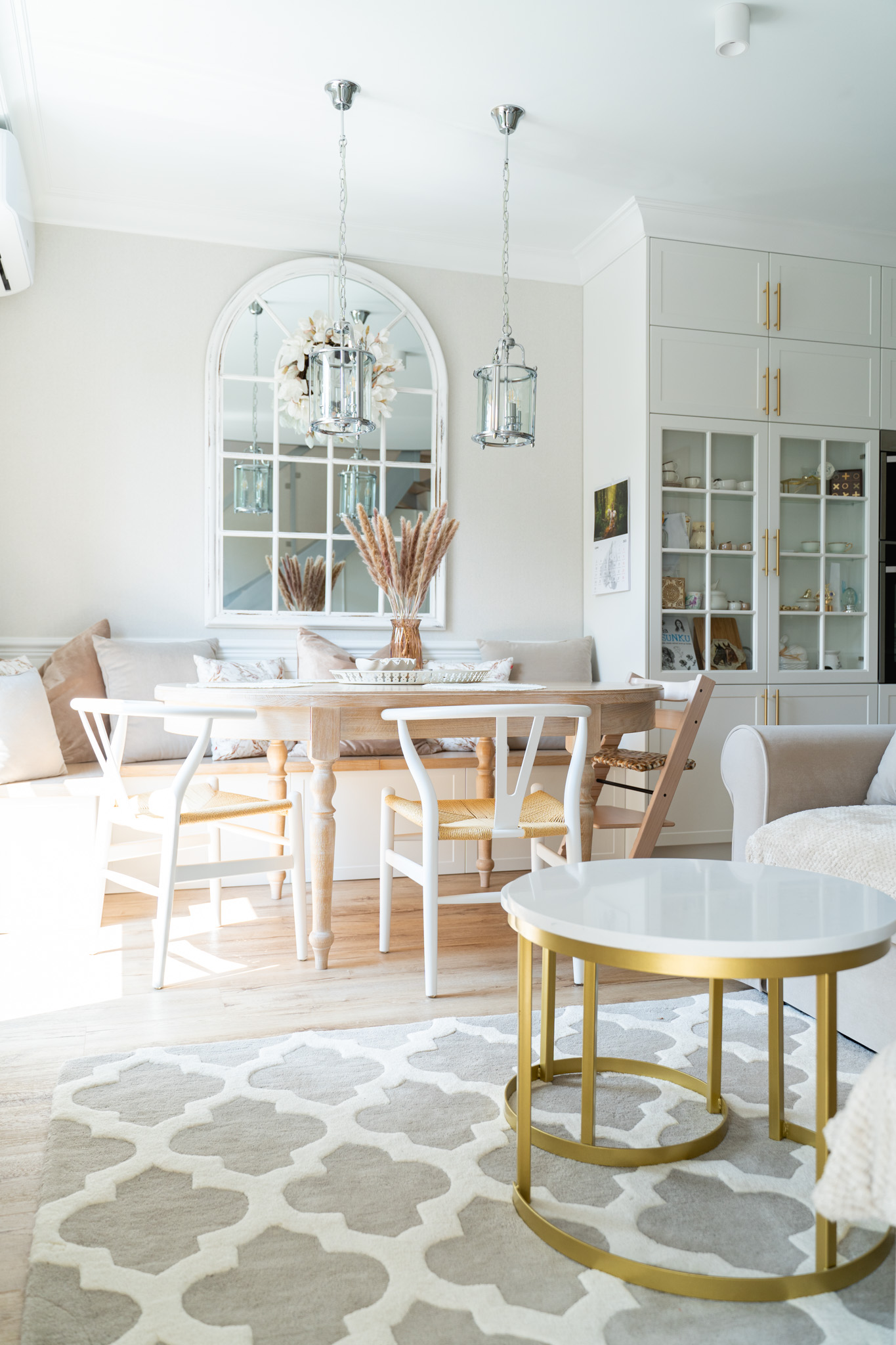Delikatne oświetlenie wiszące oraz dekoracyjne lustro nad stołem dodają przestrzeni głębi i elegancji. Kuchnia o neutralnych barwach wyposażona jest w nowoczesne urządzenia, a szafki oferują mnóstwo miejsca do przechowywania, co podkreśla funkcjonalny aspekt tego wnętrza. Całość dopełniają subtelne detale, takie jak stylowe poduszki, wzorzysty dywan oraz zharmonizowane kolory, tworząc wyjątkową atmosferę. Zapraszam do obejrzenia całej galerii zdjęć, aby poczuć unikalny klimat tego eleganckiego mieszkania na Wojszycach.
