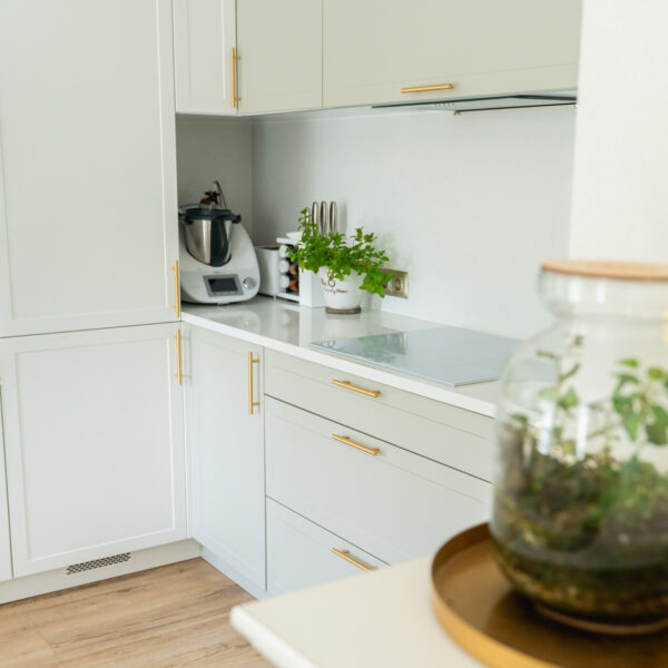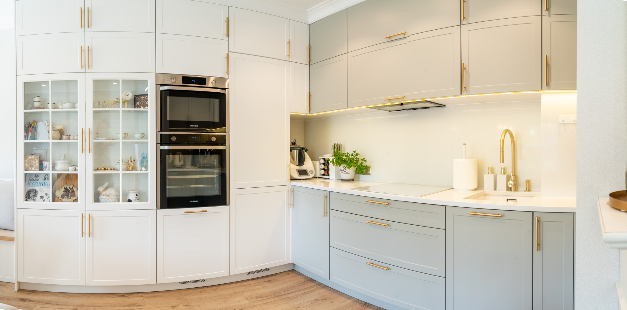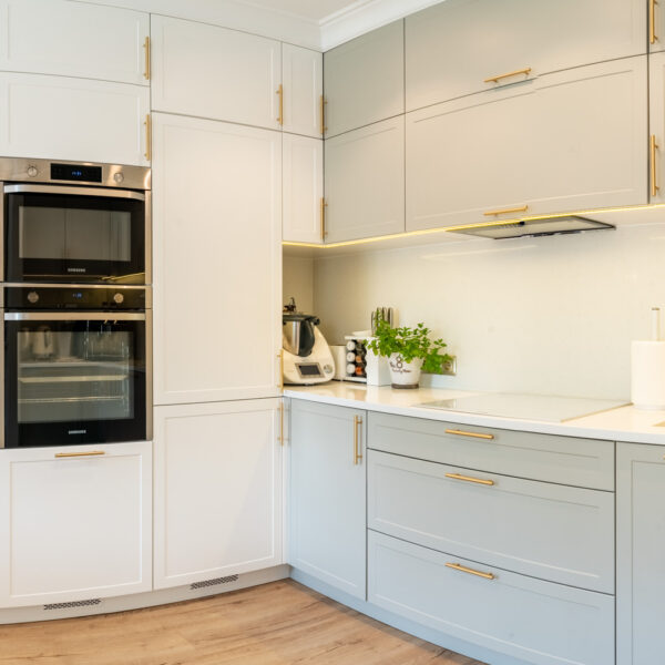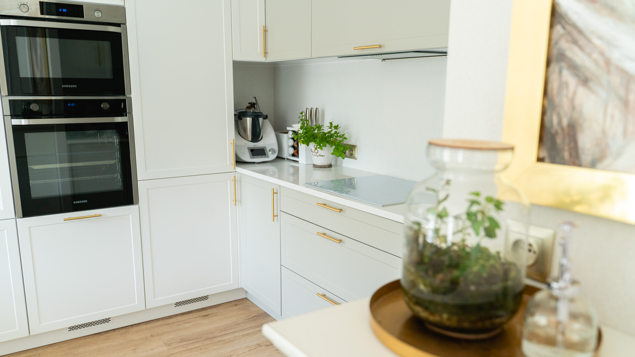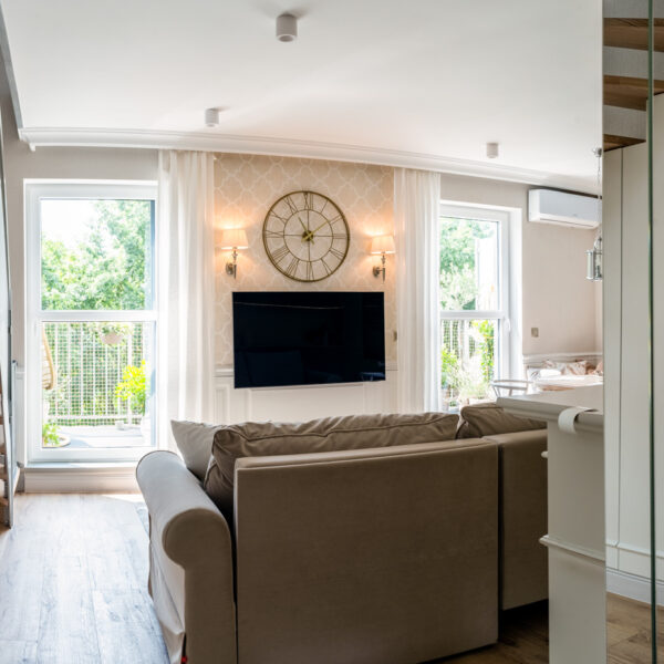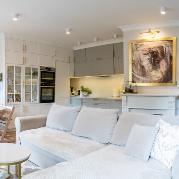 Delikatne oświetlenie wiszące oraz dekoracyjne lustro nad stołem dodają przestrzeni głębi i elegancji. Kuchnia o neutralnych barwach wyposażona jest w nowoczesne urządzenia, a szafki oferują mnóstwo miejsca do przechowywania, co podkreśla funkcjonalny aspekt tego wnętrza. Całość dopełniają subtelne detale, takie jak stylowe poduszki, wzorzysty dywan oraz zharmonizowane kolory, tworząc wyjątkową atmosferę. Zapraszam do obejrzenia całej galerii zdjęć, aby poczuć unikalny klimat tego eleganckiego mieszkania na Wojszycach.